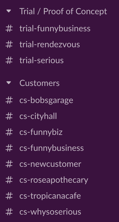 - To keep everything organized, create a section in your Slack that is dedicated for shared channels with prospects and customers. We call ours “Trial/Proof of Concept” and “Customers”.