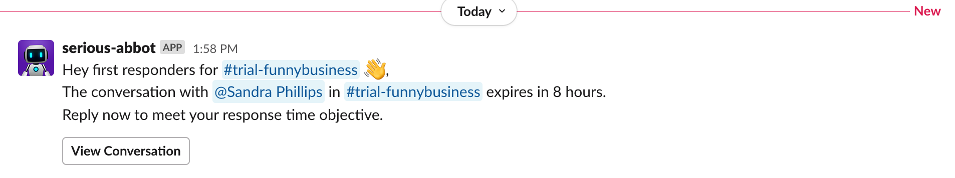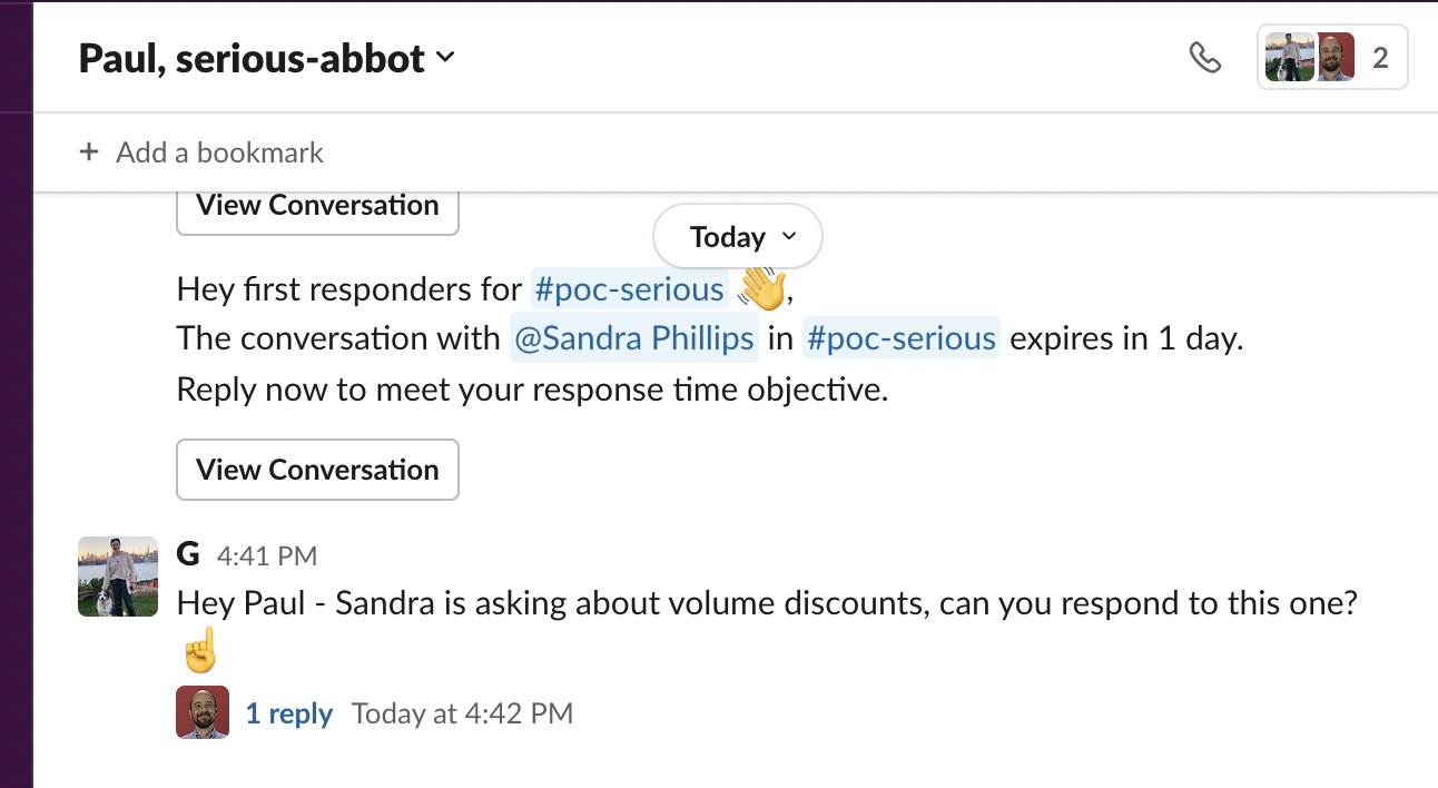 Now throughout the trial, the configured first responders will be notified in Slack of any conversations from your future customer as they approach the ‘reply by’ time settings. The result of the trial is up to you and your customer but, with Abbot you can set the tone for prompt replies and great customer support for when they sign up!