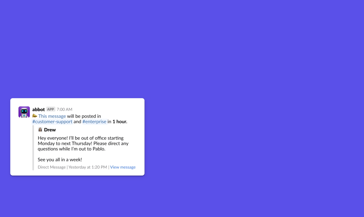 Notify your customers of new feature ships, upcoming out-of-office plans, and other updates in multiple Slack channels all at the same time with 📣 Announcements in Abbot